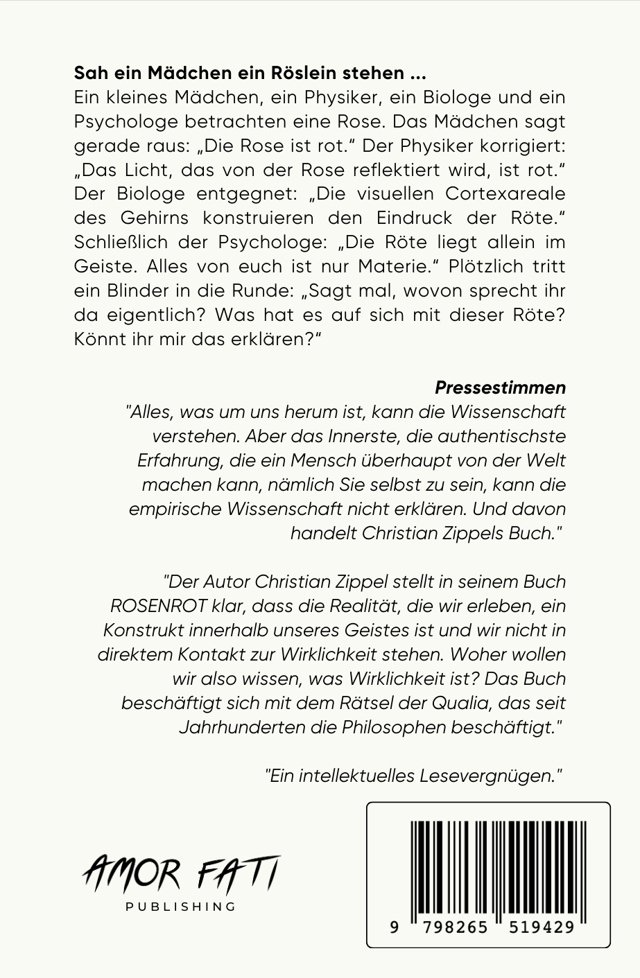 „Der Autor Christian Zippel stellt in seinem Buch ROSENROT klar, dass die Realität, die wir erleben, ein Konstrukt innerhalb unseres Geistes ist und wir nicht in direktem Kontakt zur Wirklichkeit stehen. Woher wollen wir also wissen, was Wirklichkeit ist? Das Buch beschäftigt sich mit dem Rätsel der Qualia, das seit Jahrhunderten die Philosophen beschäftigt.“